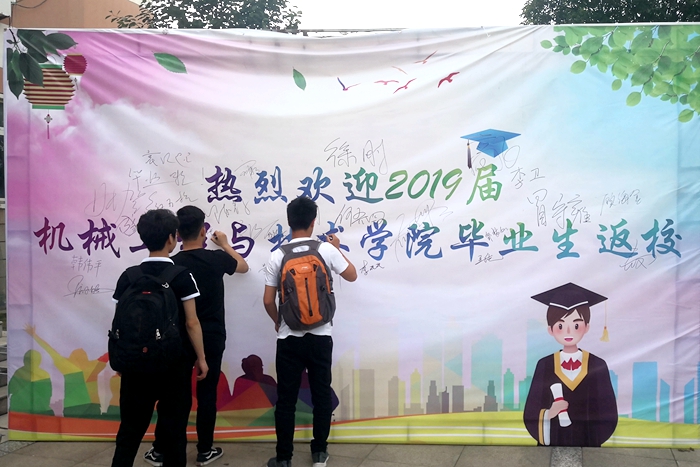 毕业生返校期间,机械学院在4号教学楼门口摆放了“热烈欢迎2019届机械工程与技术学院毕业生返校”的签名喷绘,同学们纷纷签名合影留念,营造了浓厚的毕业季氛围,表达了机械学院对机械学子返校的热烈欢迎。
