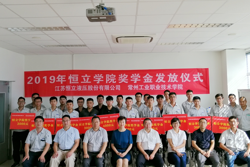 9月18日,公司2019年“恒立学院”奖学金发放仪式在江苏恒立液压股份有限公司常州铸造分公司举行。副董事长蒋新萍、校企合作处处长褚守云、教务处处长潘安霞、机械工程与技术学院经理徐伟、电气工程与技术学院副经理冷雪锋,恒立铸造副总经理庄晔、人事经理赵贤文、铸造二期经理马艳东参加仪式,并为34名优秀员工颁发奖学金。