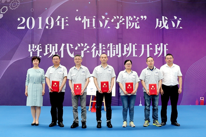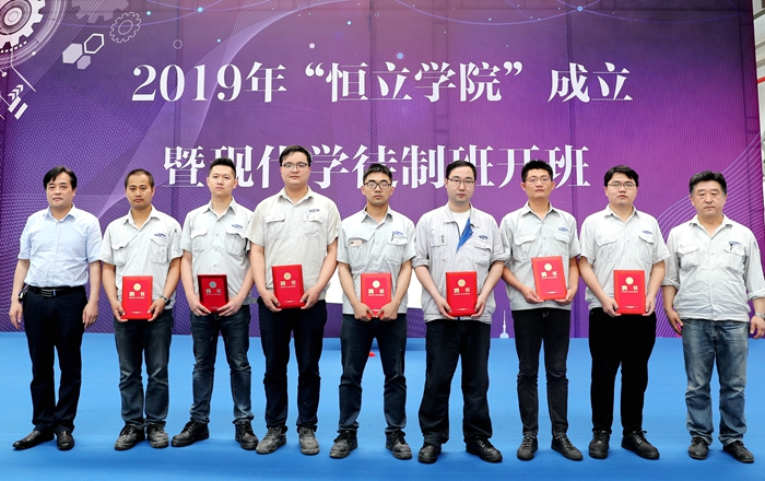 527日,公司江苏恒立集团共建的企业学院——“恒立学院成立暨2019年现代学徒制班开班仪式在江苏恒立液压股份有限公司铸造分公司举行。公司党委书记缪昌武和江苏恒立集团总经理邱永宁共同为恒立学院揭牌,董事长杨劲松和恒立铸造总经理杨连伟为孙祥广等七位产业教授颁发聘书,副董事长蒋新萍和总经理庄晔为孙斐等五位企业导师颁发聘书。