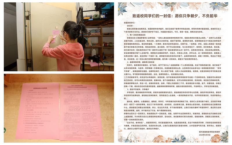 写有“现代装备制造学院欢迎同学们回家”的红色欢迎横幅,悬挂在宿舍楼前。同学们来到自己的宿舍前,会看到一张红纸贴在门上,上面写着:“亲爱的同学,欢迎你回家!宿舍已消毒,已打扫,已通风。”同学们走进宿舍,迎面而来的是一股清新的空气,脚下是干净的地面,看到整洁的书桌上放着“疫情期间宿舍生活指南”和“k8凯发国际疫情防控员工突发事件应急处理流程图”,走到床边会闻到从被子里散发出的“一股阳光的味道”。