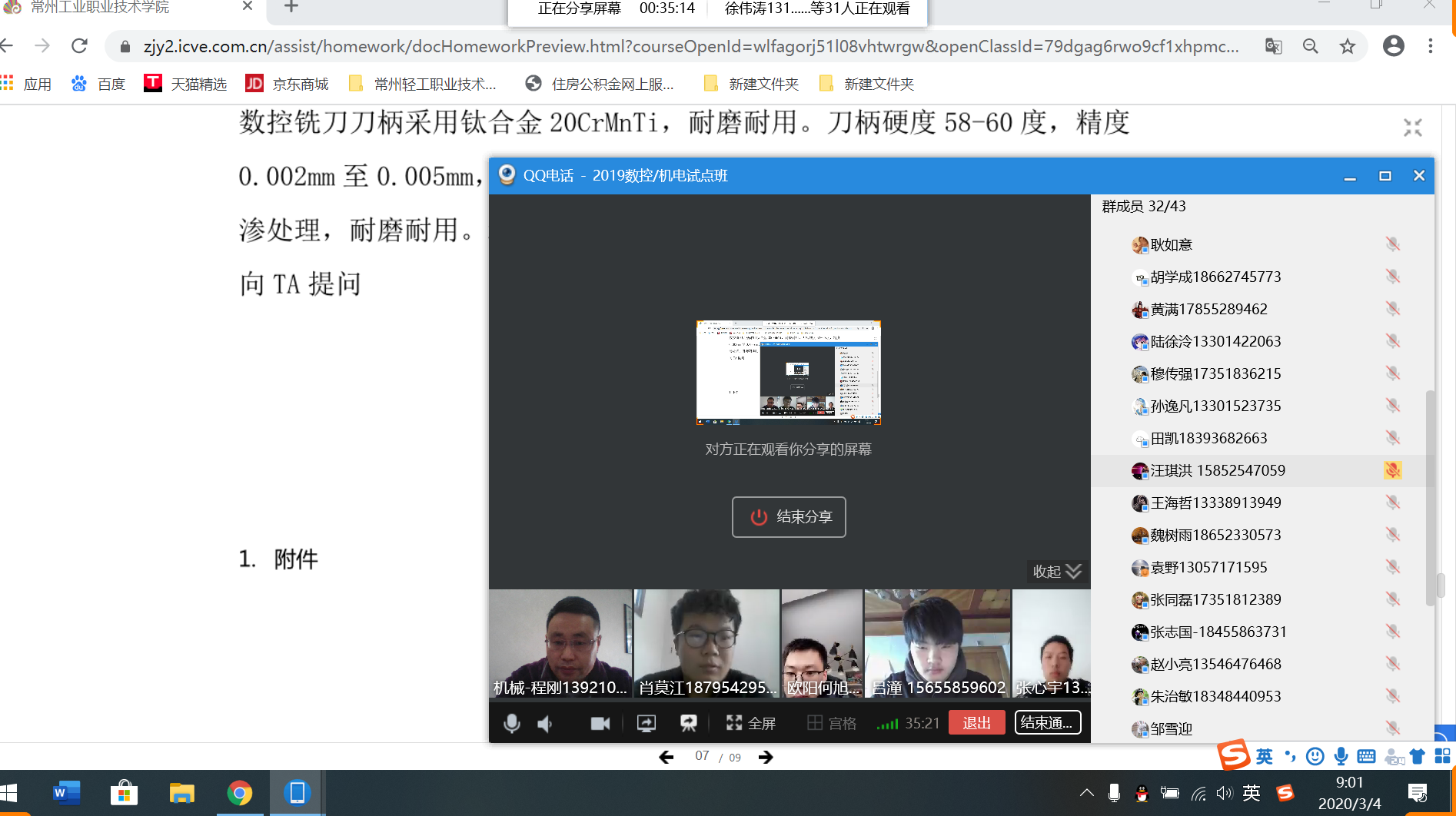 二:胡格团队教师在线听课情况 本周3.4下午1.00-1.30QQ直播课程:机械加工棱柱形零件-手动冲压机制作,团队三名教师章磊、吴传权、潘琴跟19胡格班一起听课。