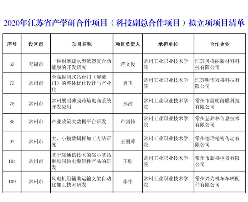 2020年江苏省产学研合作项目(科技副总合作项目)公司立项清单如下: