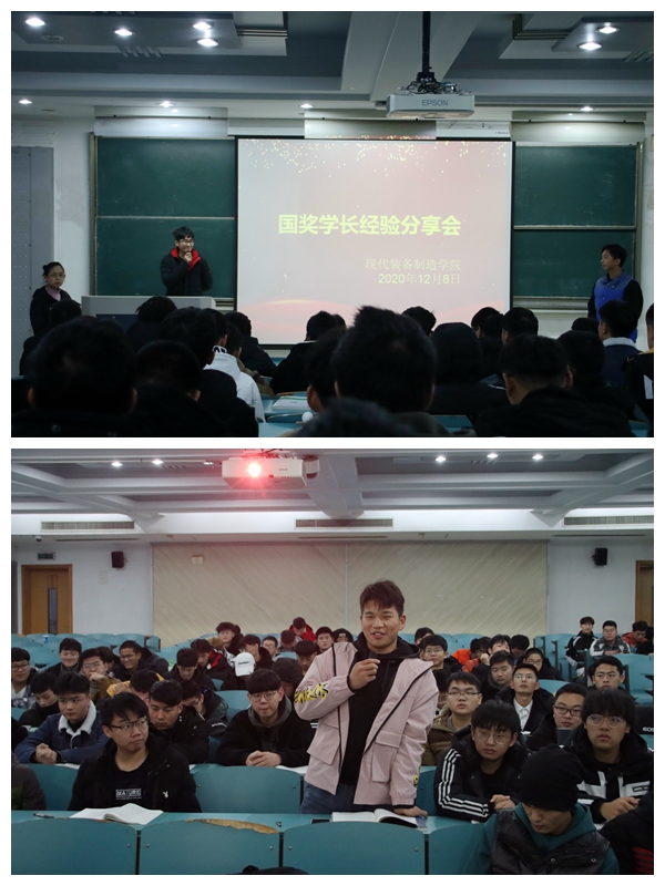 为了进一步激发同学们的求知热情,提高学习积极性,帮助同学们更好地明确学习发展的目标,12月8日,现代装备制造学院邀请2020年国家奖学金获得者万世豪、郑敬栋两名同学给2020级同学进行学习经验分享。本次活动由辅导员姚依倩主持。