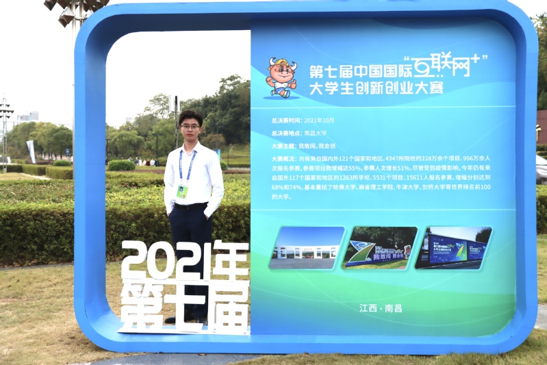 功夫不负有心人,网评结果出来了,团队的项目顺利进入全国总决赛。项目的开发过程中小组也碰到了很多难题,大量的查阅资料,随着大量的文献资料不断地被汇总、整合,思路也越来越清晰,最终通过多次改进,多次试验,讨论推敲方案,逐步完善,最终解决了项目存在的痛点问题。经过几个月的赛程长跑,他所在的团队最终在南昌大学举办的第七届中国国际“互联网+”大赛中取得了银奖,虽然与金奖擦肩而过,但是他说:“这一次没能拿到金奖虽然遗憾,但是在这个比赛中我学到了很多知识也同时拓展了自己的视野,学到了很多知识,这次经历我将终身难忘。”