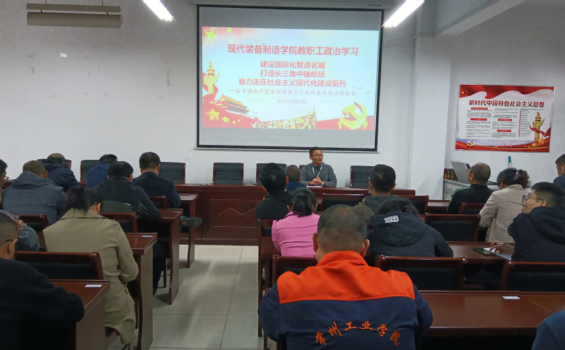 为深入推进“两在两同”建新功行动,2021年10月20日,现代装备制造学院召开教职工政治会议学习在中国共产党常州市第十三次代表大会上的报告——“建设国际化智造名城,打造长三角中轴枢纽,奋力走在社会主义现代化建设前列”。现代装备制造公司党总支书记林伟主持会议。现代装备制造学院全体教职工参加会议。
