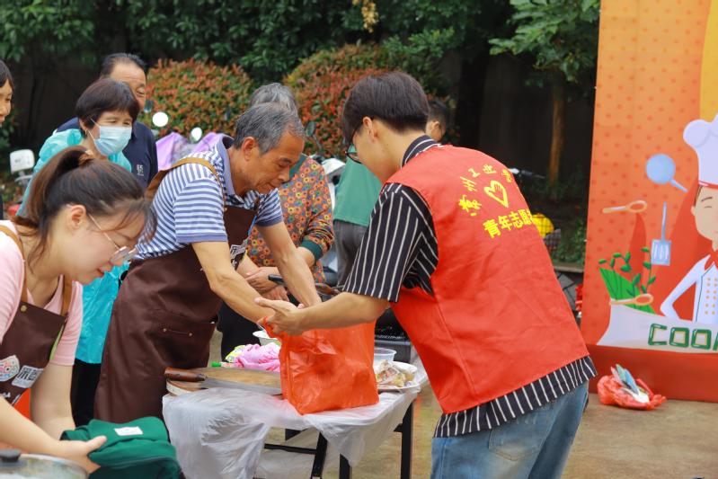 活动前期青年志愿者们联同社区进行了场地的布置和厨具的安排。活动在轻松愉悦的氛围中拉开了序幕,来自采菱社区的各家庭“煮妇煮夫”们开始有条不紊地忙碌起来了。洗菜、切菜、焯水、炒菜……一派热火朝天的景象。志愿者在现场也忙的不亦乐乎,穿行活跃在每个参赛队伍之间,体会着劳动的价值。社区居民对志愿者的热情服务,给予了充分肯定。