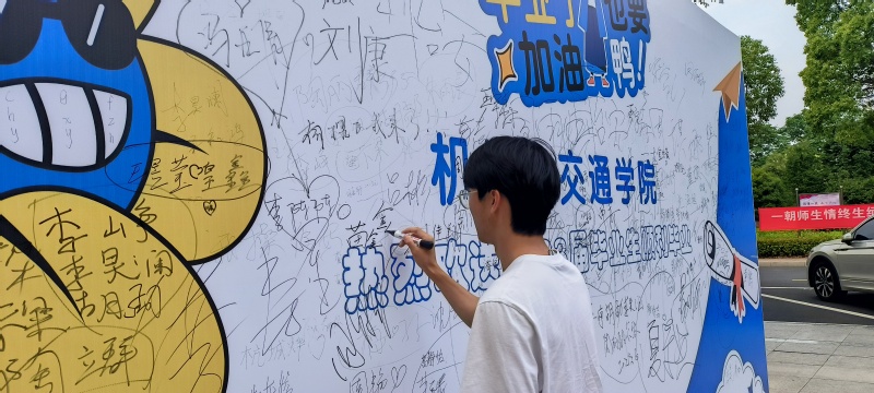 星光不问赶路人,时光不负有心人。同学们聚集在校园的一处特别准备的签名墙前。他们用心书写着对校园、对老师和同学们的感激之情,用文字和画笔勾勒出这三年来的点滴回忆。每个人都用心地在上面写下了自己的名字、班级和一段祝福的话语,这将成为他们留给学校的珍贵纪念。