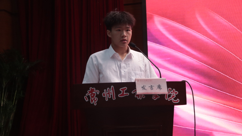 徐伟代表学院全体师生祝贺各位新同学齐聚新能源之都常州,圆梦常州工业学院,开启人生新征程。他表示:学院全体教师将竭尽全力关爱、尊重、欣赏、成就每一位有理想的同学;我们的教师也有信心、有能力把同学们培养成杰出的技术技能型卓越人才。他希望同学们始终将“爱岗敬业,自强不息”和“孝老爱亲,感恩知责”的学校文化铭记于心,把“工于匠心,技以载德”的专业文化摆在案头,努力成为技术技能的“王者”,真正具备“与祖国同行”的本领。