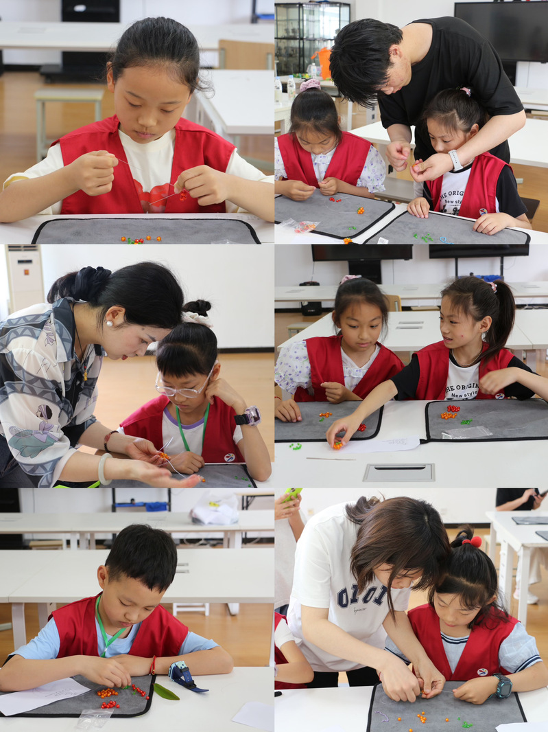 活动以“匠心传承文化”为主题,围绕端午节元素展开。在工坊指导老师的讲解下,小记者们学习了串珠技艺的历史背景与端午文化象征,随后动手制作了象征“事事如意”的柿子、寓意“丰收吉祥”的石榴、代表节庆的粽子及创意花卉等作品。活动现场,孩子们专注穿珠配色,工坊社员现场示范并纠正手法,引导他们将传统文化符号转化为精美的手工艺品。