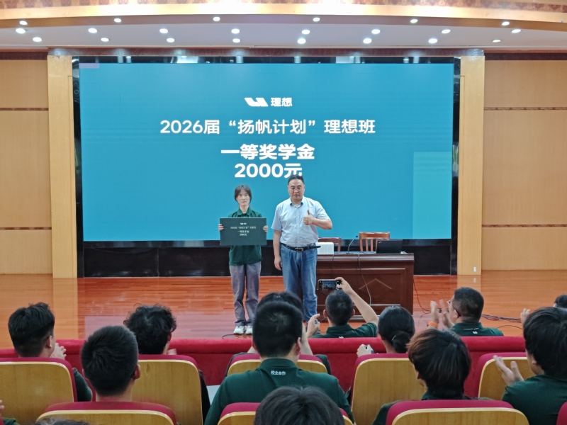 活动现场,校企双方代表为获得理想汽车2026届“扬帆计划”奖学金的同学颁奖并合影留念。