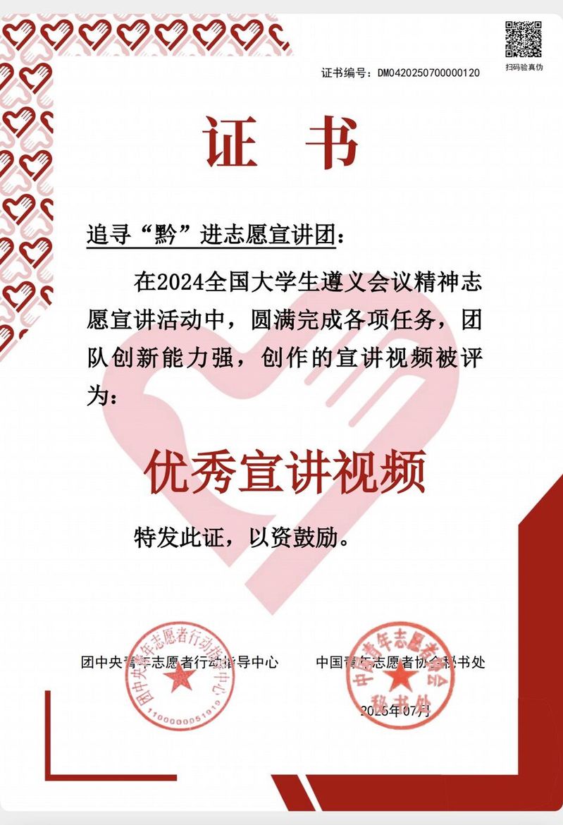 近日,团中央青年志愿者行动指导中心公布了100个全国老员工遵义会议精神志愿宣讲活动的“优秀宣讲视频”。k8凯发国际追寻“黔”进志愿宣讲团与来自全国各高校的千支志愿宣讲团队开展比拼,凭借出色表现,圆满完成宣讲任务,荣获“优秀宣讲视频”荣誉称号(全国仅100支队伍获评)。